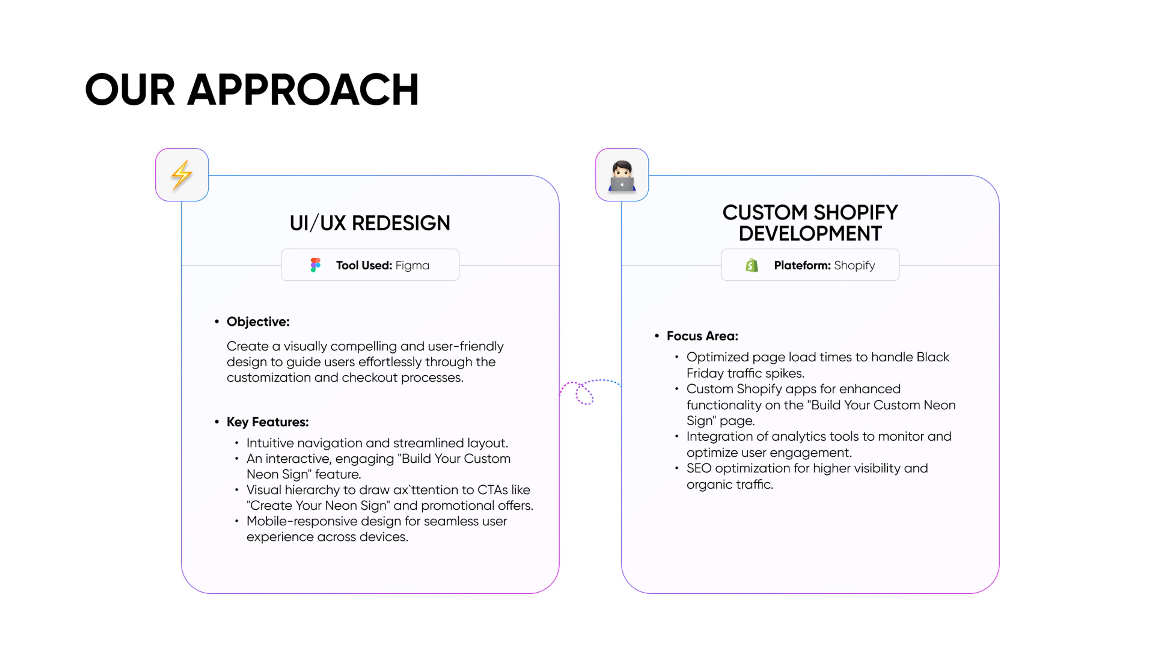 Focus Area: Optimized page load times to handle Black Friday traffic spikes. Custom Shopify apps for enhanced functionality on the "Build Your Custom Neon Sign" page. Integration of analytics tools to monitor and optimize user engagement. SEO optimization for higher visibility and organic traffic.